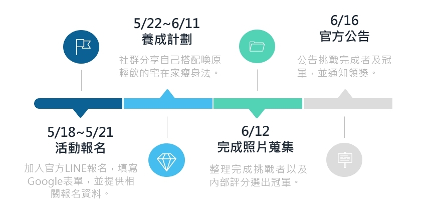 於5/22~6/11期間共21天,分享你的宅在家瘦身日常,需搭配使用喚原輕飲。