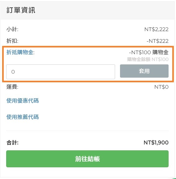 ▶︎如果有購物金,請點選「折抵購物金」欄位,輸入本次想使用多少購物金後套用即可!