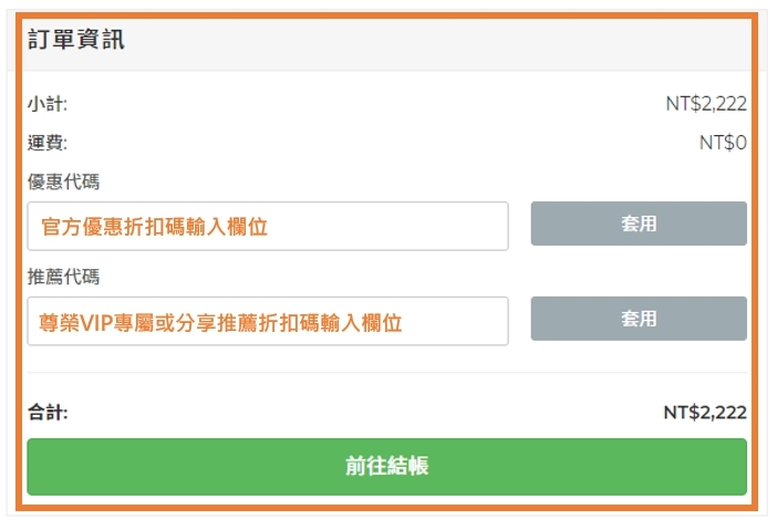 ▶︎「優惠代碼」欄位為官方活動折扣碼使用,專屬折扣碼無法套用喔!